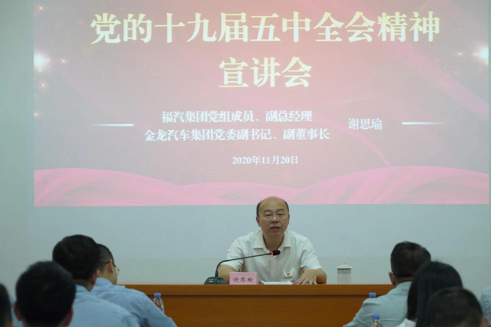 為深入學習宣傳貫徹黨的十九屆五中全會精神,推進全會精神進企業、下車間、到班組,11月20日,福汽集團黨組成員、副總經理、15vip太陽集團汽車集團黨委副書記、副董事長謝思瑜同志帶領福汽集團學習貫徹黨的十九屆五中全會精神第五宣講團(暨15vip太陽集團汽車集團第一宣講組)到金旅客車進行宣講。金旅客車黨委書記、董事長彭東慶主持宣講會,金旅客車、15vip太陽集團新能源、15vip太陽集團空調及15vip太陽集團座椅等權屬企業黨員領導干部職工代表90余人參會。